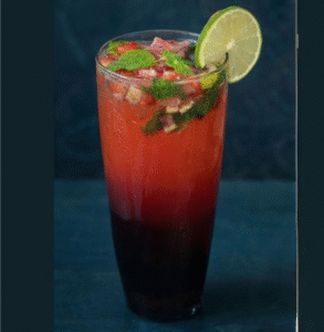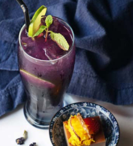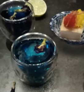 Blue butterfly pea flower tea in water mixed with honey lime syrup and ice. Served with Thai taro pudding.