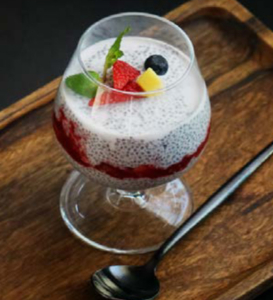 Coconut milk soaked chia seeds with the goodness of honey, vanilla, strawberry puree and fresh berries