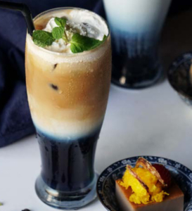 Blue butterfly pea flower tea mixed with cold latte, milk and topped with either whipped cream or vanilla ice cream. can be with or without sugar. Served with Thai taro pudding.