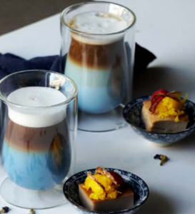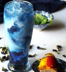 Blue butterfly pea flower tea mixed with hot milk and latte. can be with or without sugar. Served with Thai taro pudding.