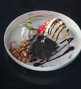 Soft Warm Chocolate Brownie served with Salted Butter Caramel, Whipped Cream and Vanilla Ice Cream.