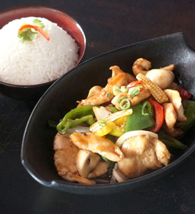 Stir fried Mixed Bell Pepper, Onions, Spring Onions, Mushroom, Garlic and Baby Corn in rich Oyster Sauce served with Rice. (Shrimp)