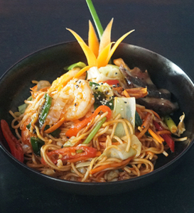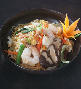 Soba Noodles stir fried in Yakisoba sauce with White Cabbage, Shiitake Mushroom, Carrots, Spring Onions, Red Capsicum and Sesame Seeds. (Shrimp)