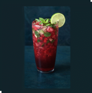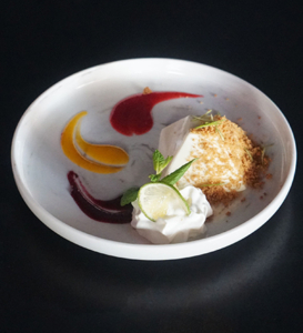 Thai lime flavoured creamy cheese cake with cinnamon crumbled butter biscuits, served a trio of fresh strawberry, red berry and mango coulis.