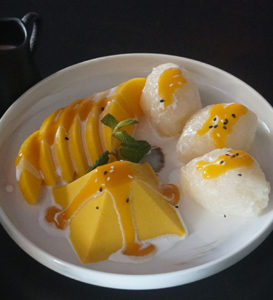 Mango panna cotta and sweet coconut sticky rice topped with coconut milk sauce, served with mango coulis and slices of mango.
