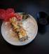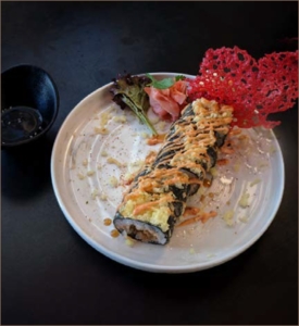 Sushi Rice with Chicken, Shrimp, Avocado and Tomato wrapped in Seaweed and served with Spicy Japanese Mayonnaise.