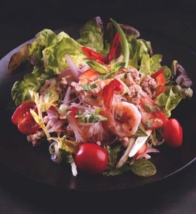 Unrippen papaya, Shrimp, cherry tomatoes & green beans, marinated with aromatics, lime juice, red thai chili and fish sauce.
