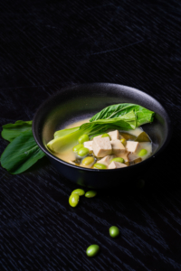A savory, comforting broth made with traditional miso paste, seaweed, and tofu.