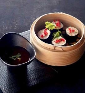 Seaweed wrapped Dumplings filled with Chicken, Shrimp, White Cabbage, Shitake Mushrooms and Celery and Coriander.
