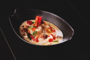 Coconut Milk Soup with Lemongrass, Galangal, Kaffir Leaves, Lime Juice, Chili, Mushrooms and tomatoes.