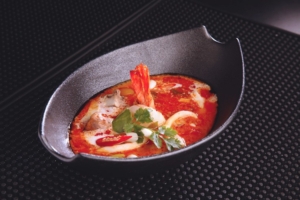 Vegetable Soup with Lemongrass, Galangal, Kaffir Leaves, Lime Juice, Chili, Mushrooms, Tomatoes, and Onions, topped with Coriander. Shrimp and Chicken